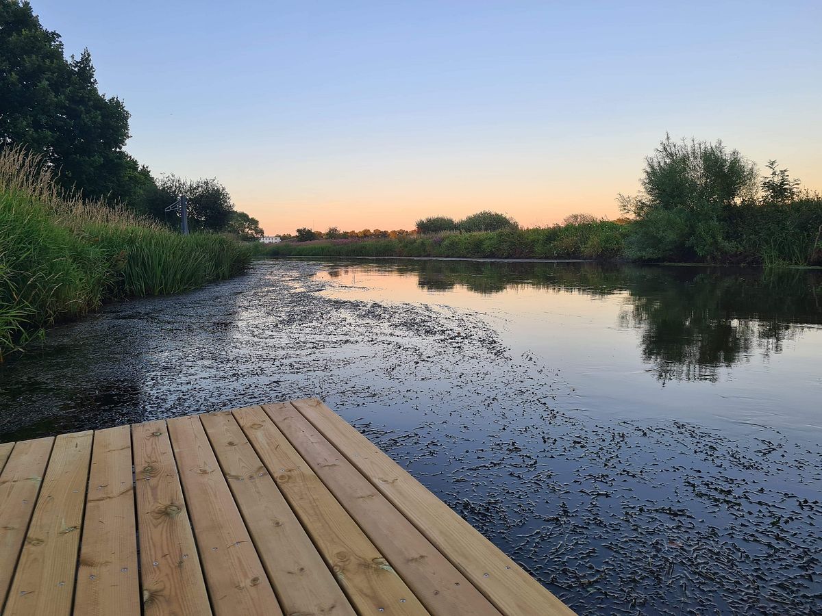 Vi holder til i et naturskønt område lige ned til Varde å. Her har vi både vores lille klubhus og egen flydebro.